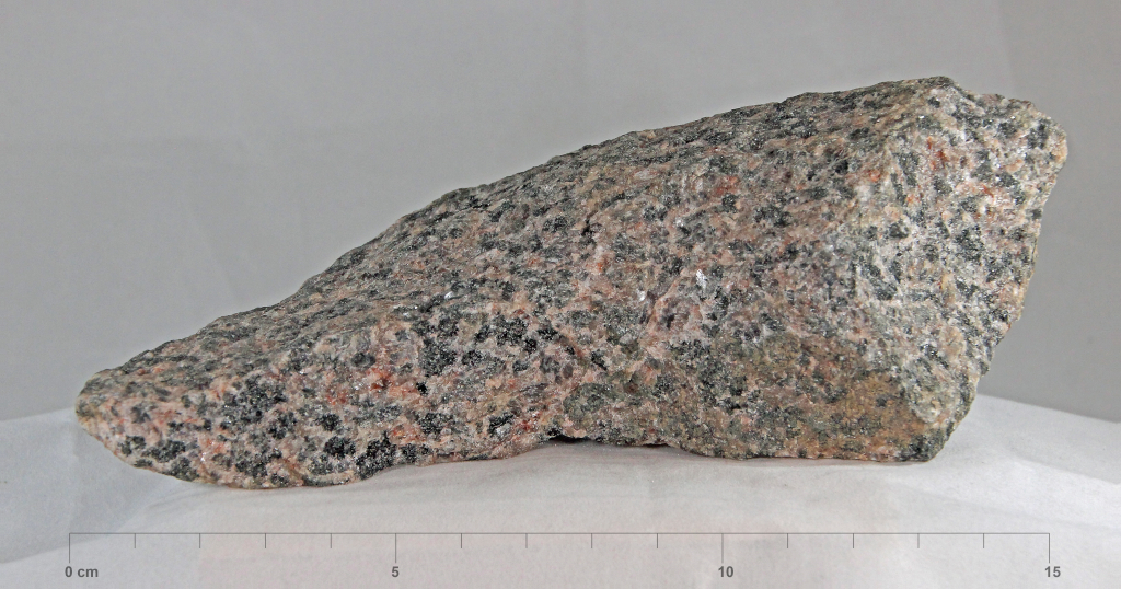 Mellemkornet med puslespilsmønster, overfladen på mange af kornene er imprægneret med et koralrødt farvestof, der danner iøjnefaldende pletter eller rosa skjolder. Mørke mineraler samlet i ret store uregelmæssige pletter. Rødlige 1-2 com kalifeldspatter og grålige kvartskorn. P.Smed 3. udgave: nr. 106 P.Smed 4. udgave: nr. 107